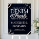 A modern, elegant and chic, denim and pearls couple's shower welcome wedding sign with a denim and diamonds and pearls theme. It features a denim background, elegant rhinestones and pearls (these are digital effects, not real stones or pearls!) custom letters for the word "denim" and typography in white. A chic "denim and diamonds and pearls" wedding shower welcome sign for a modern couple who loves denim.
