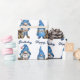 Cute denim watercolor gnomes with a dog and fluffy cat.