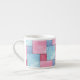 A pretty, espresso mug, with a patchwork of pink and blue denim pattern, from a handpainted watercolour design by Judy Adamson.
