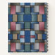 A symmetrical arrangement of textured, fabric-like rectangles in muted tones of blue, green, pink, and beige. The layout resembles a patchwork quilt or mosaic, with each block meticulously aligned to create a balanced, grid-like structure.