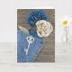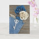 Denim roses in blue jean pocket with antique key on rustic barn wood.