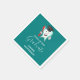 Paper napkins with an illustration of a cartoon style big white tooth smiling happily holding a red toothbrush and giving the thumbs up sign. Tooth is wearing a black graduation cap. Green background.