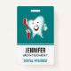Name badge with an illustration of a cartoon style big white tooth smiling happily holding a red toothbrush and giving the thumbs up sign.