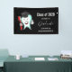 Graduation banner with an illustration of a cartoon style big white tooth smiling happily holding a red toothbrush and giving the thumbs up sign. Tooth is wearing a black graduation cap.