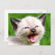 A dental checkup reminder postcard with a photograph of a funny little Siamese kitty cat baring all his baby teeth in a big scary smile. Words on the front reads: It's checkup time. You're never too young to see your dentist.