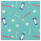 Cute fabric featuring a pattern of dentistry instruments in turquoise, blue, and red.