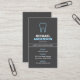 Stylish, dark gray, vertical dentist or dental assistant business card featuring a blue outline of a tooth. Customizable name, title, business name and contact information on the front. Dark gray back. A bold and modern design for a dentist, hygienist or any other dental professional.