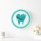 A professional dental wall clock with an image of a tooth for a dentist's office, dental practice, or dental supplies business.