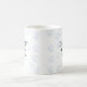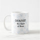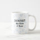 Dentist theme coffee mugs with teeth symbols all over the cup in a pattern, and funny saying Dentist the boss of floss. Designed as a gift or gag gift for a dentist, dental assistant, or dentist office promotional gift.