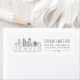 This label features a stylized illustration of the city's unique skyline with its name underneath.