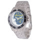 Has heft and feel of expensive stainless steel quartz watches. Good band with safety catch. I removed links, which is easy because engraved arrows show direction to push the linking pins. As always by this seller, the image (a railroad logo) is a perfect reproduction of my emailed image, and is precisely spaced and aligned.