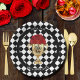 Party paper plates - in 2 sizes - feature a gold trophy filled with red roses on a black and white check background with your names and date in chic lettering.