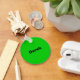lime green keychain with writing on it.