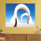 Unveiling 'Desert Arcana: Monoliths of Memory', a profound art print that captures the intersection of history and the timeless. A figure clad in the elegance of darkness contemplates an imposing structure where the past seems to unravel into the present. Monumental arches rise from the sands, one a seamless loop to the sky, the other a fragmented stairway, each stone a testament to the stories that time forgets. The arches stand as gatekeepers to the unknown, their dual nature a dialogue between the ephemeral and the eternal. With a backdrop of serene blue and the untouched sands of the desert, 'Desert Arcana: Monoliths of Memory' invites viewers to traverse the layers of their own histories, beckoning them to reflect on the monuments they will leave behind in the sands of time. Photo collage art and design © 1201AM