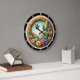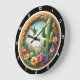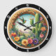 Capture the vibrant life of the high desert with the Desert Bloom Hummingbird clock. This stunning timepiece features a high-definition graphic centered on a brilliant, multi-colored hummingbird in mid-flight. The bird is surrounded by a lush desert garden, including a towering Saguaro cactus, various succulents, and a colorful array of blooming desert flowers in shades of coral, amber, and deep violet. The scene is set within a beautifully detailed, ornate carved-wood circular frame that offers a glimpse of distant mesas under a soft sky. While the artwork masterfully mimics the dimensional textures of hand-carved wood and oil-painted canvas, this is a durable high-definition graphic application on a premium round clock face. It is a prestigious and heartwarming addition to any Southwestern-inspired decor.