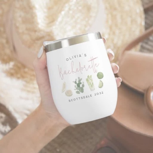 Get the party started with these cute wine tumblers that are easy to personalize for your bachelorette party, hen night, or girls' weekend! Desert boho style design features delicate watercolor illustrations of lemons, limes, a cactus, and a mixed cocktail in a soft color palette of sage green with dusty rose pink accent lettering. Personalize with three lines of custom text; shown with the bride's name, event type, location and date.