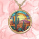 Desert Cactus Sunset Stained Glass Gold Plated Necklace