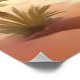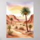Poster in an illustration of a serene desert landscape showcasing golden sand dunes and rocky formations under a pastel sky, with lush palm trees scattered throughout. The soft, warm colors evoke a sense of tranquility and natural beauty.