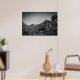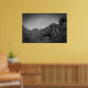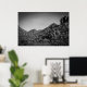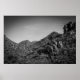 A black and white landscape with graffiti on the rocks.