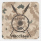 A military brown "subdued" style depiction of a Maccabee's shield and two spears on a desert camo background. The shield is adorned by a lion and text reading "Yisrael" (Israel) in the Paleo-Hebrew alphabet. English text reading "Maccabee" also appears.