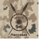 A military brown "subdued" style depiction of a Maccabee's shield and two spears on a desert camo background. The shield is adorned by a lion and text reading "Yisrael" (Israel) in the Paleo-Hebrew alphabet. English text reading "Maccabee" also appears.