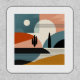 An abstract landscape of a desert scene with lines and shapes in shades of brown, orange, turquoise, beige, tan, and black.