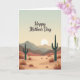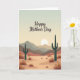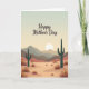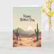 Designed with a serene desert scene, the card shows layered mountain ridges in soft sepia, gray-green, and dusty rose fading toward the horizon beneath a gentle, glowing sun. In the foreground, two tall cacti in deep teal-green stand side by side like close companions, their shapes leaning the eye toward each other with a quiet, caring mood ❤️. The sandy ground is painted in warm ochre and burnt sienna, with small russet shrubs and scattered pebbles adding texture across the open space. The sky shifts in a smooth gradient from pale mint near the top to warm cream closer to the sun, giving the whole scene a calm early-morning or late-evening feel. Centered above the landscape, the words “Happy Mother’s Day” appear in brown lettering, floating neatly in the open sky. The message sits high enough to stay clear of the mountain peaks, leaving the wide horizon uncluttered and easy to take in 🌼. Subtle layering in the distant ridges creates depth, and the sun’s soft halo lightly brightens the area behind the text. The two cacti are positioned slightly left and right of center, framing the open desert path between them.
