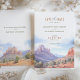 Announce your special day with our Desert Mountain Save the Date card, featuring the iconic red rock formations of Sedona, Arizona. The front showcases elegant typography in earthy tones of taupe, beige, and sandy brown, perfectly complementing the watercolor illustration of Sedona's breathtaking landscape. The back continues this theme, displaying a tranquil scene of the majestic red rocks and desert flora against a bright sky blue backdrop. Ideal for couples planning a picturesque and unique desert wedding, this card beautifully blends natural hues with sophisticated design elements.