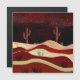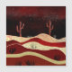 Abstract landscape scene of a desert with saguaro cactus, scrub brush, hills, and stars in shades of red, crimson, and beige and bold textures.