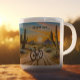 Start your morning adventure with a bold splash of color and a tribute to the trail. This premium two-tone coffee mug features a high-quality painterly illustration of a mountain bike resting on a sandy desert path, framed by towering saguaro cacti and purple mountains under a golden sunset. The contrasting interior and handle add a modern, stylish touch that complements the rich, earthy tones of the Southwest artwork. The "DESERT RAT" text is fully customizable, allowing you to add your name, a favorite trail destination, or a personal biking milestone to create a unique vessel for your pre-ride caffeine fix.