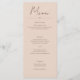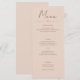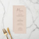 This elegant minimalist wedding menu card features refined typography and a soft blush background for a timeless and sophisticated reception table setting. The clean layout highlights each course while maintaining a modern and understated design that complements contemporary wedding stationery suites.