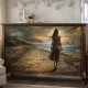 Create extraordinary pieces with this captivating dreamscape decoupage paper. This mystical design merges fantasy with reality, featuring a solitary wanderer in an ethereal green dress traversing a dramatic landscape where cracked earth meets ocean waves beneath a spectacular golden sky.