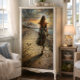 The rich color palette combines warm earth tones, deep emerald greens, and luminous golds, creating an enchanting atmosphere perfect for unique furniture transformations. The striking contrast between the parched earth and flowing water, combined with the mysterious figure, brings a powerful narrative element to your creative projects.