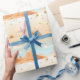 'Desert Serenity,' a wrapping paper design that captures the tranquil beauty of the desert. Under a vast and clear blue sky, the rolling sand dunes stretch into the horizon, creating a scene of peaceful solitude. Dotting this sandy landscape are small cacti, each thriving in its own way, symbolizing resilience and life's perseverance. This design brings a unique and serene touch to your gifts, transporting the recipient to a world of quiet majesty and natural wonder. Perfect for those who appreciate the subtle yet profound beauty of nature, 'Desert Serenity' adds a distinct and thoughtful elegance to any present.