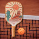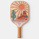 Play in style with this cool pickleball paddle featuring a retro vintage desert landscape design with a "pickleball sun", cactus, mesa mountains and flowers. Add 3 lines of custom text - name, monogram, pickleball club name, company name, location, phone number, etc. A perfect gift for adults, kids, moms, dads, or anyone who plays pickleball near the desert.