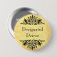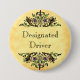 A Designated Driver button with Thanksgiving art of a cornucopia, a symbol of a bountiful harvest, with fruits and vegetables on a faux parchment background.