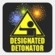 A funny design for the person lighting the pyrotechnics at your Independence Day celebration, this illustration features a yellow caution triangle with a black icon of a person holding a lighter inside. Colorful fireworks explode above the triangle, and yellow text beneath says “Designated Detonator.”