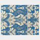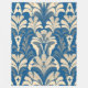 A seamless pattern features stylized floral motifs in shades of beige and cream against a rich blue background. The symmetrical design is evocative of Art Deco influences with its geometric shapes and intricate detailing.