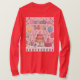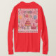 This is a pretty red and pink women's holiday t-shirt. This t-shirt features a whimsical birthday illustration with a pink background showing a cute October 14th text at the top in pastel colors. The main focus is a three-tiered birthday cake with yellow and pink layers, decorated with pink drip frosting and small candies. The cake sits on a mint green cake stand. Around the cake are various pastries: pink and yellow cupcakes with cherry toppings, a chocolate cupcake and a pink ice cream cone. Cute balloons in yellow, mint green, light blue and pink float in the scene. Colorful streamers and confetti are in the background. A garland of triangular flags in blue, green and pink runs along the top of the image. The bottom of the image features a row of cupcakes in pastel colors arranged in a repeating pattern. The illustration has a soft, cartoon-like style with rounded edges and simple shapes. Small black sparkles decorate the pink background. The t-shirt is a red women's long sleeve t-shirt. The t-shirt has unisex sizing and runs true to size. The t-shirt is made of 100% cotton.