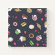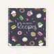 Recipe notebook featuring doodles of desserts, like donuts, cupcakes, and macarons against a muted bluish dark gray background. Add your name in white!