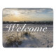 Welcome door sign that can be customized featuring a dramatic beach sunset scene behind some small sand dunes and sea oats grass looking towards a large rock jetty. A silhouette of a pelican and gull fly's over a man sitting on the jetty watching the sunset. What a great way to end the day in Destin, Florida. Looking for more prints or products? Feel free to visit my store: http://www.zazzle.com/timelessmomentsphtgy