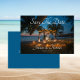 Destination Beach Wedding Save The Date Announcement Card. Design features a candle lit cabana on a white sandy beach with palm trees an ocean in the background. The front text includes: Save The Date, the Bride and Groom's Names and Wedding Date. The reverse side text includse: The Wedding Location Name, Details and Formal Invitation To Follow - on a tropical blue background. To personalize, simply insert your text details into our easy template replacing the sample. Available in print or digital download.