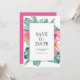 These custom save the date invitation cards feature a boarder of elegant watercolor tropical flowers and palm leaves. The words "Save the Date" are typeset in charcoal grey over a crisp white background. use the template fields to type your personalized information. The card reverses to a matching vibrant pink color. To see more of this destination wedding theme visit www.zazzle.com/dotellabelle