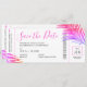 Tropical or beach destination birthday trip save the date boarding pass in bright hot pink, coral and purple ombre palm tree leaves (fronds) on a simple, modern, and minimal and colorful boarding pass airline plane ticket save the date card. All text can be personalized, as well as the text and background color. Click CUSTOMIZE FURTHER to do this in the advanced editor. Travel, accommodations, and itinerary details on the back can be filled in, or removed entirely if you don't have the plans finalized.