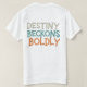 The t-shirt design features the empowering message "Destiny Beckons Boldly" in a bold, multicolored font. The colors could be varied and energetic, reflecting the adventurous spirit of the phrase. This design is perfect for those who embrace their own unique path and chase their dreams with courage.