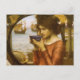 Destiny (1900) by JW Waterhouse is a vintage Victorian Pre-Raphaelite fine art portrait painting. A beautiful young woman is standing in front of a mirror drinking hot tea from a bowl. Boats can be seen in the harbor in the reflection in the mirror.