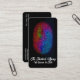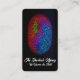 A fingerprint under a blacklight on a black background. This is a business card for private investigators, detective agencies or security professionals