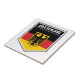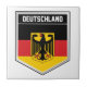 The national flag of Germany is infused into a shield shape and the emblem of the country is set in the center of the flag. The country name of Deutschland is above the image but inside the shield shape.