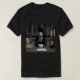 A t-shirt depicting a scary character looking right into the camera, sitting behind a desk in a medieval office with dark fantasy and gothic attributes, like a skull and medieval books. Concept of signing a contract with a demon.