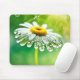 A close-up of a white daisy is adorned with water droplets, shimmering as they catch the light against a bright green background. Sun rays filter through adding a warm glow